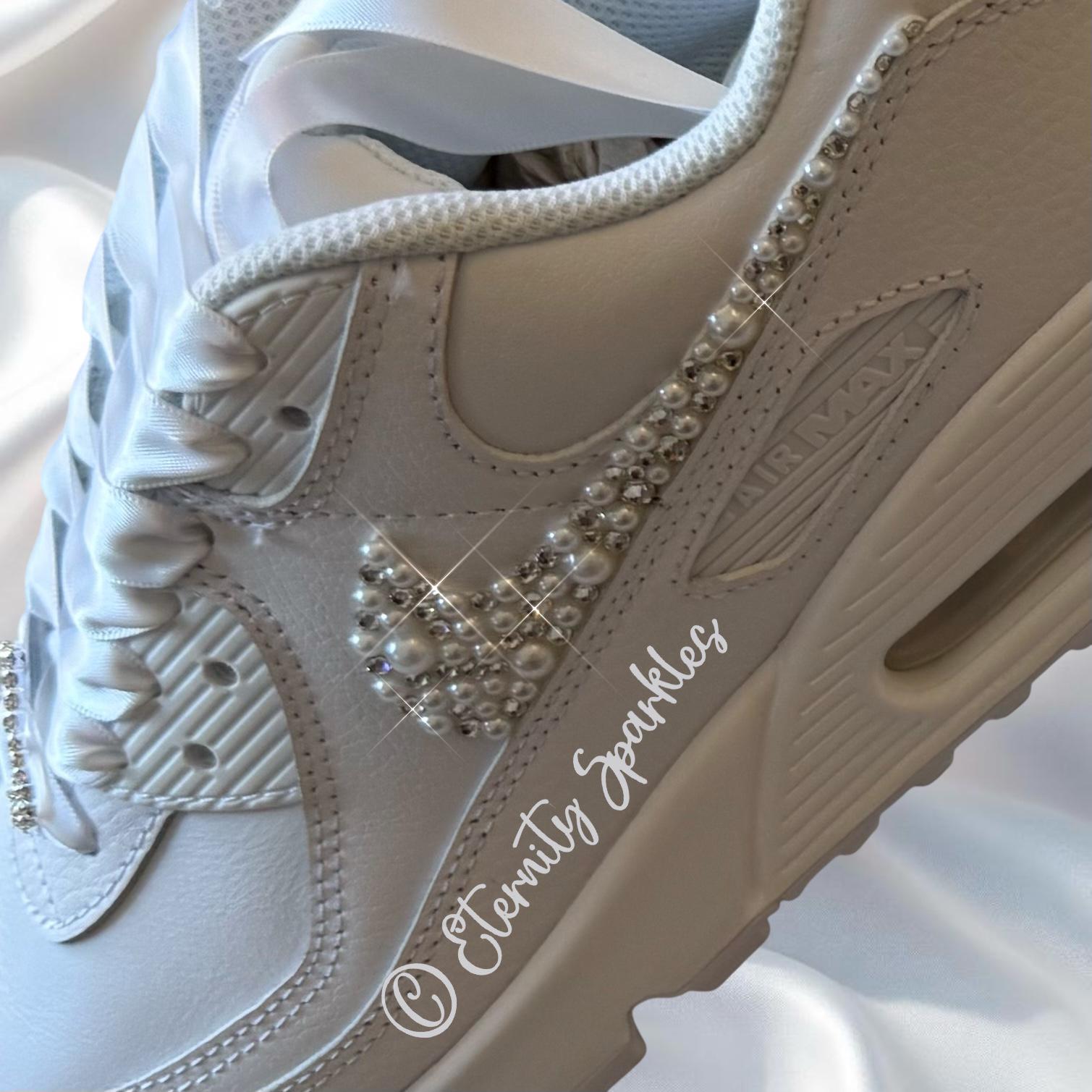 Custom Nike Air Max 90 White Personalised Luxury Pearl & Crystal Sparkle Bridal Trainers
