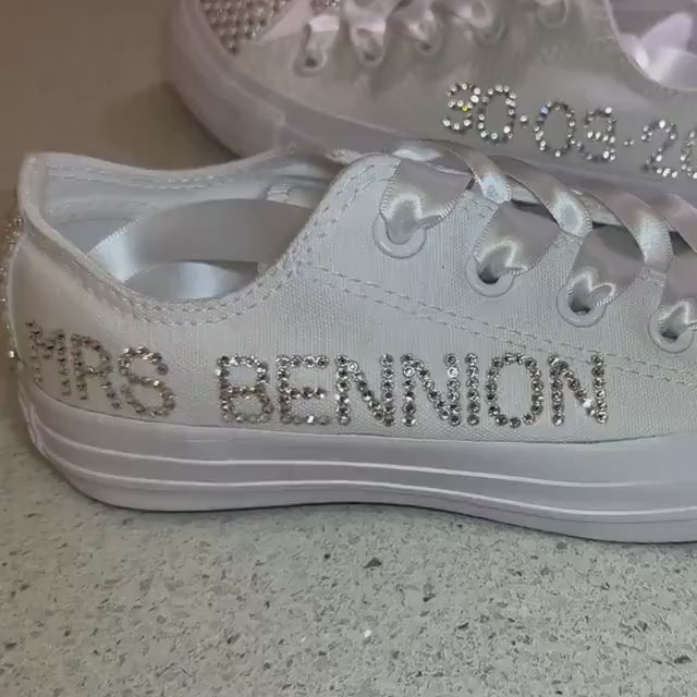 Custom Converse Mono White Personalised Luxury Pearl & Crystal Sparkle Bridal Trainers Sneakers
